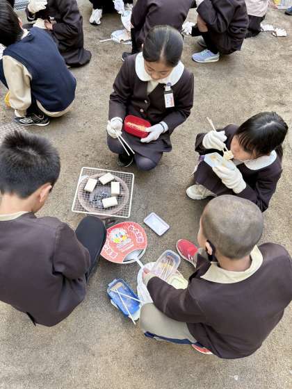 中庭で、七輪を使っておもちを焼く体験をしました。最初はなかなか炭に火がつきませんでしたが、火の加減を見ておもちを焼くことができました。