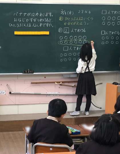 バナナを例に様々な分け方のパターンを考えました。考え方の共有の時間では、みんなの前で自分の考えを説明します。上手に説明できるようになってきましたね。