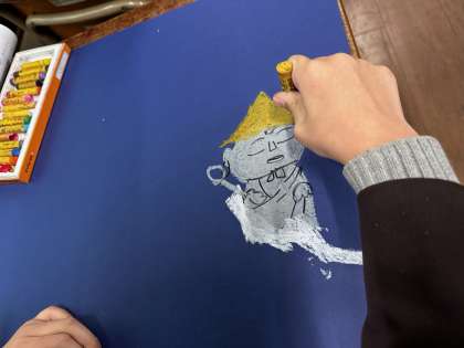 今日は図工でかさこじぞうの絵をクレパスで描きました。