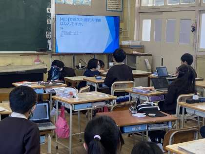 クラスで「習い事は何をしていますか?」や「外食派ですか、家で食べる派ですか?」などのアンケートをとって報告会をしています。パワーポイントにしたり、表にしたりして、各班工夫して発表しています。