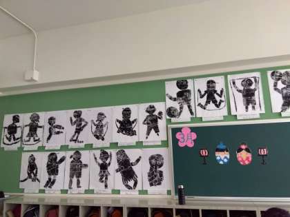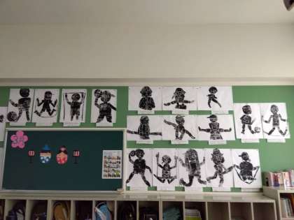 今回は、動きのある紙版画にチャレンジしました。縄跳びをしたり、跳び箱を跳んだり、ボールを投げたりと細かいところまでこだわって作成しました。