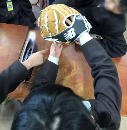 ついに1年生にも大谷選手のグローブが届きました。みんなすごく嬉しそう。順番にグローブを手にはめました。「野球やりたい…!」という声がたくさん上がりました。