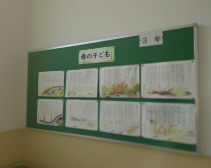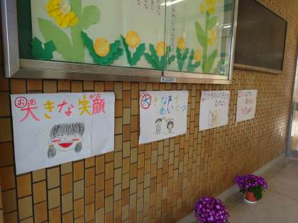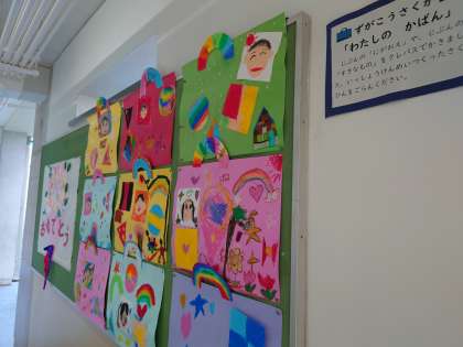 子どもたちの作品や、子どもたちが決めたスローガンなどを掲示しています。
