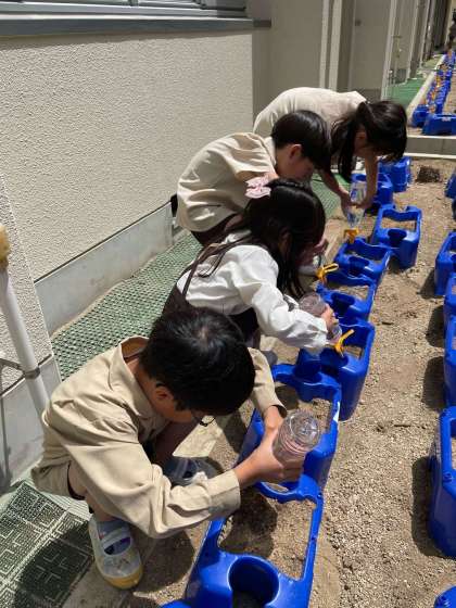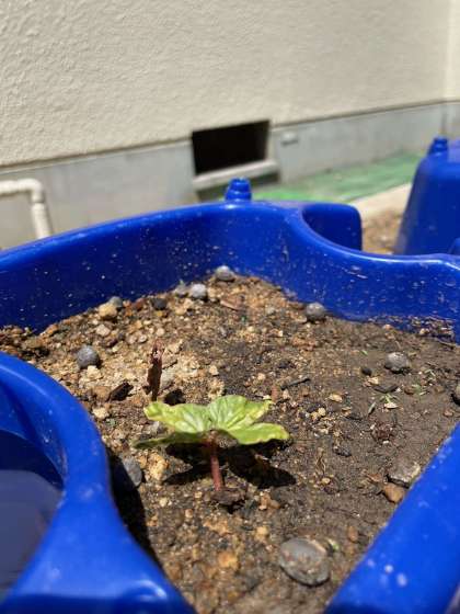 あさがおの種を植えた鉢に、毎朝水やりをしています。新芽が少しずつ顔を見せています。