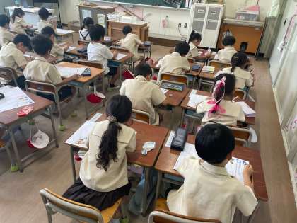 いらがなの学習を終え、国語のテストに一生懸命取り組んでいます。