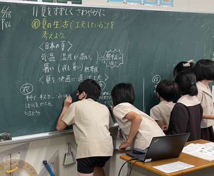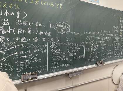 家庭科の学習で、夏の生活の工夫について考えました。快適に過ごすためには、どんな工夫をすればよいか衣食住に分けて考えました。いろいろな考えを共有することができました!