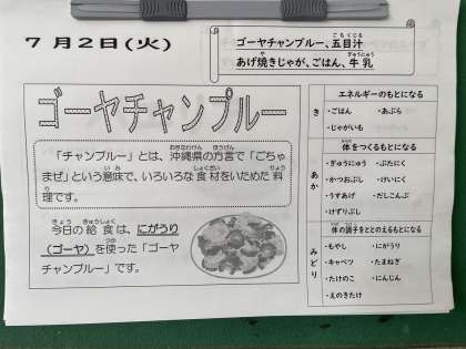 今日は夏野菜「ゴーヤ」を使った「ゴーヤチャンプルー」が献立に登場です。「チャンプルー」とは、沖縄県の方言で「ごちゃまぜ」という意味があります。