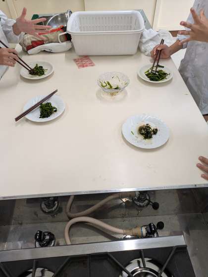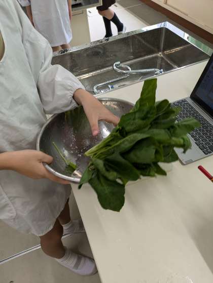 「ほうれんそうのおひたし」を作りました。ゆでることで苦かったほうれんそうにうまみが出ました。ほうれんそうが苦手な人もみんなおいしく食べました。包丁も使い全員が無事に終えることができてよかったです。