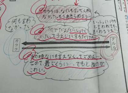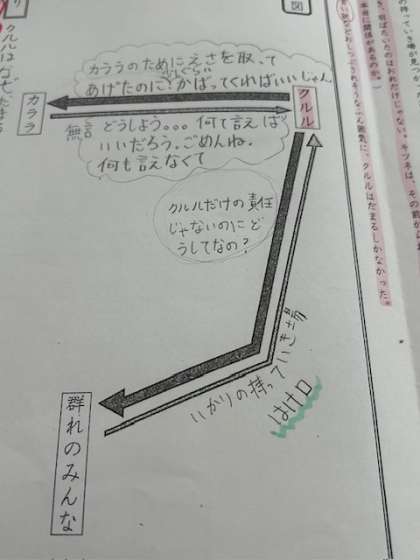各場面の本文から読み取った登場人物の心情をワークシートに書き込み、考えを深めていきます。