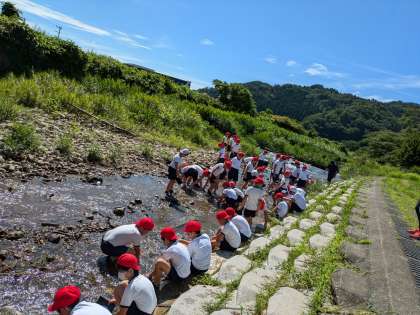 焼板を洗うチームは、川の水を使って焼板を磨いていきます。