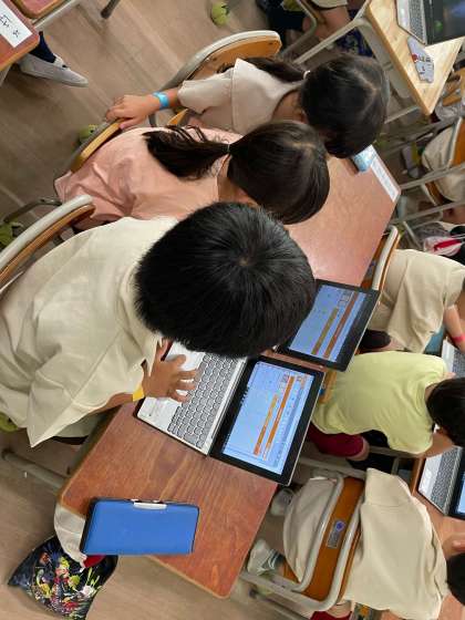 タブレット端末の使い方を、中大淀幼稚園のきりん組のみなさんに教えました。