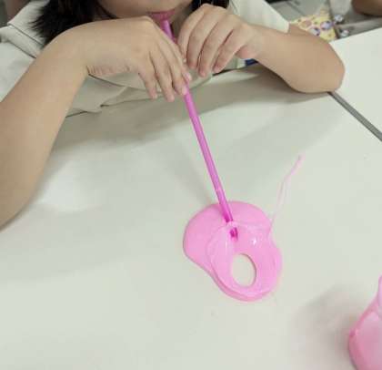 出来上がったスライムに、ストローから空気を送り、風船をつくって遊びました。