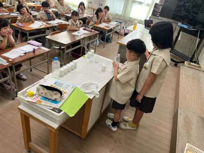 同じ大きさのカップに、水がいくつ分入るかを実演しました。