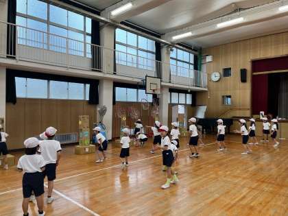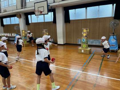図工の時間に作った的に向かってボールを投げる的当てゲームをしました。