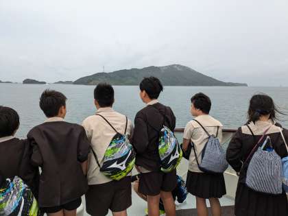 雨の中、そして風が強い中ですが、観光船に乗っています。寒さに負けないぞ!