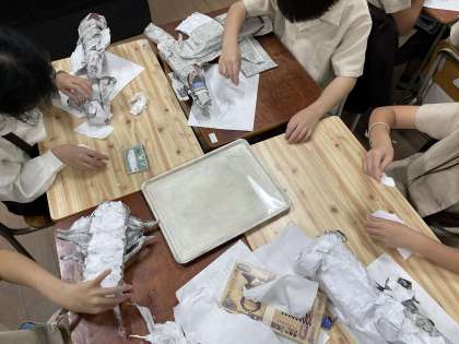 今回から、新聞紙で動物の体を形どったものに和紙を貼り付ける工程に入りました。