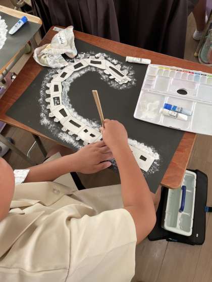 まずは汽車をかき、車輪や窓を切り抜きました。カッターで上手く切り抜くのに苦戦しましたが、思い思いの形の汽車ができました。黒の画用紙に仮止めし、汽車の周りをタンポで色づけしました。