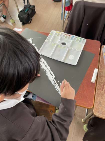 まずは汽車をかき、車輪や窓を切り抜きました。カッターで上手く切り抜くのに苦戦しましたが、思い思いの形の汽車ができました。黒の画用紙に仮止めし、汽車の周りをタンポで色づけしました。