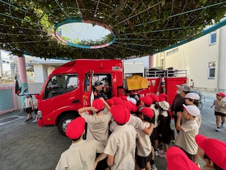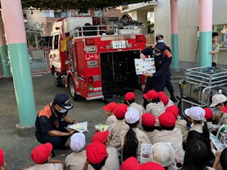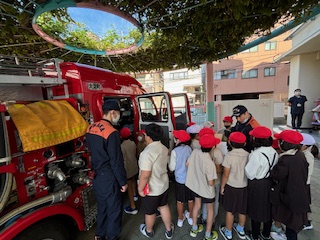 中大淀幼稚園に消防車が来ていたので、3年生は社会科で消防車の学習をしていて、特別に消防車を見せてもらえました。消防士さんに直接質問したり、実際に少しだけサイレンを鳴らしてもらいました。大阪市は道が狭いので、消防車が少し小さめにできているそうです。子どもたちも本物の消防車に興味津々でした。