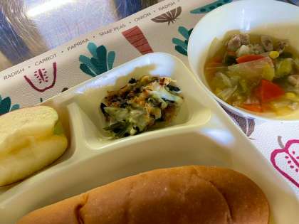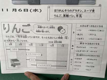今日の献立には、グラタンに使われているほうれんそう、スープ煮に使われている大根、デザートのりんごなど、季節を感じる食材が多く使われています。
