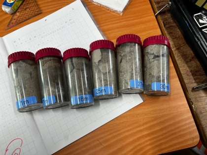 大淀小学校のボーリング試料を使って地表からの深さごとに、どろ・砂・れきの観察を行いました