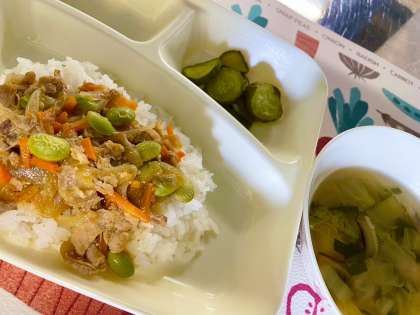 「ピリ辛丼」は、しょうが、にんにく、トウバンジャンを炒めたものに具材を加え、赤みそをベースにした調味液で味付けをしていきます。
