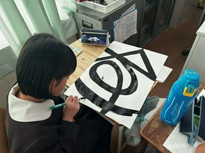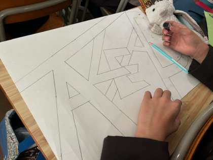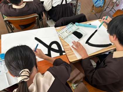 まずは、自分の名前を画用紙いっぱいにかき、絵の具で黒く塗ります。