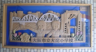 当時の6年生が下絵を描き、井波の彫師の方に彫っていただいたそうです。そこにはスカイビルや淀川、伸び伸びと学ぶ子どもたちが描かれています。