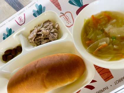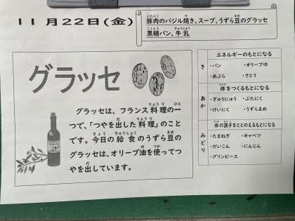 「グラッセ」はフランス料理の一つで、「つやを出した料理」のことです。今日の給食の「うずら豆のグラッセ」は、オリーブ油を使ってつやを出しています。