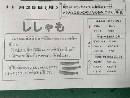 「ししゃも」は、カラフトシシャモ(カペリン)と呼ばれるものを給食では使っています。