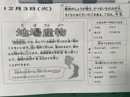 給食では、地産地消の一つとして、大阪で栽培、収穫された「菊菜」が使われています。
