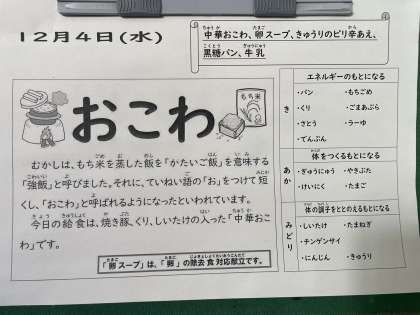 今日の給食では、焼き豚、くり、しいたけの入った「中華おこわ」が提供されています。