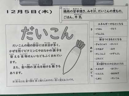 大根は、かぜを防いだり、消化を助けたりする働きがある野菜です。風邪が流行する季節ですので、食べ物から予防していきましょう!
