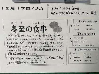 昔から、冬至には「ん」のつく食べ物を食べると、「運」がよくなるといわれています。「ん」が二つはいるとさらによいとされ、その一つが「かぼちゃ(なんきん)」です。たくさんの栄養素を含んでいる「かぼちゃ」を食べることで、寒い冬を元気に乗り切ろうという昔の人の知恵でもあります。