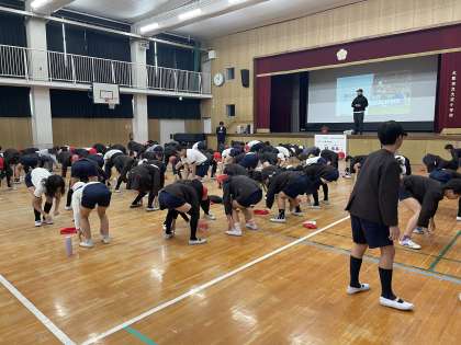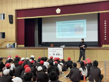 12月19日(木)、ラグビー元日本代表の林泰基様にお越しいただき、体育授業を行っていただきました。2時間目は、講堂で「夢を叶える」「友達を大切にチャレンジし続ける」というテーマでお話していただきました。この後は、運動場で実際にラグビーを体験します!