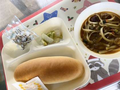 今日は子どもたちの大好きな「カレーうどん」が登場です!寒い日に“あったか”メニューはうれしいですね!