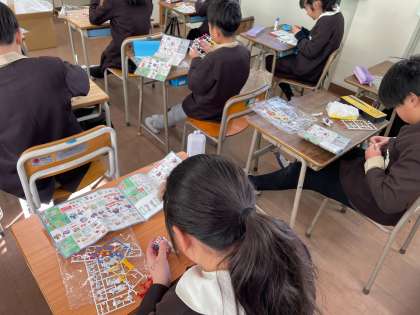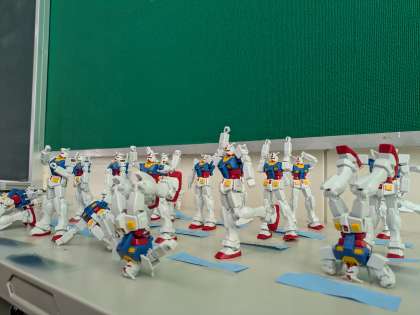 バンダイナムコさんのプロジェクトでガンプラを作りました。廃ランナー(プラモデルの周りの部分)を使用しているため、少しずつ色の割合が違います。作った後のランナーは再度回収して再生に使います。みんなでポーズをばっちり決めました。