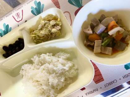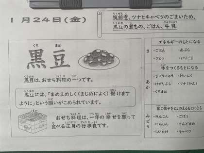 1月の給食では「おせち料理」でよく使われる献立が登場します。今日は「黒豆の煮物」が登場しました!