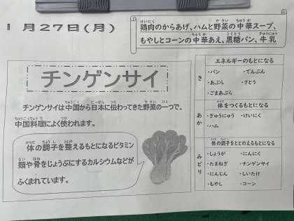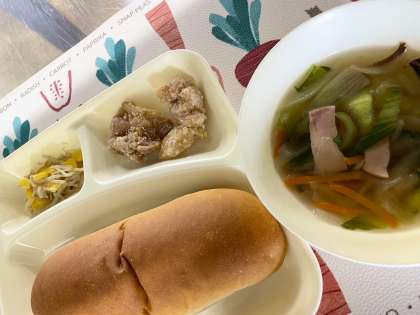 今日は「中華」が主体の献立です。「鶏肉のからあげ」は、子どもたちから大人気の献立です!鶏肉はしょうが汁とにんにく、塩、こしょうで下味をつけたものにでんぷんをまぶし、からっと揚げたものが提供されました。