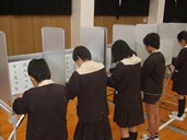 本物の選挙と同じように、仕切りのあるところで用紙に書き、本物の投票箱に入れました。