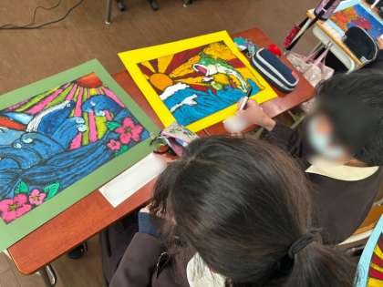 まずは自分の作品の工夫したところをカードに書き、次に友だちの作品の良いところを探します。