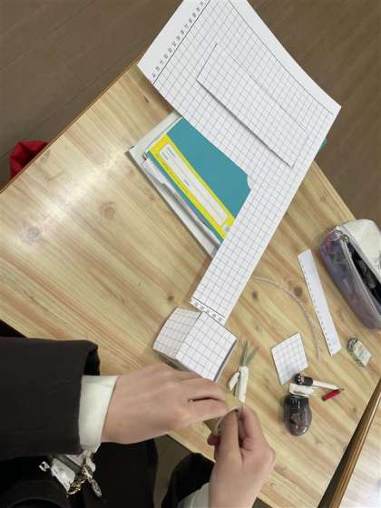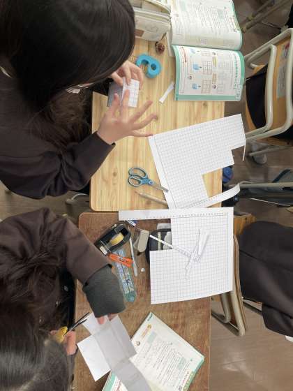方眼紙から異なる大きさの面を6つ切り出し、それらを組み合わせて直方体や立方体をつくることができました。