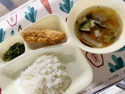 今日は「くず」を使ったお汁ものが出ています。今日使われている「くず」はじゃがいものでんぷんから作られたものを使っています。寒い日にとろみのついたお汁ものは、体があたたまりますね!
