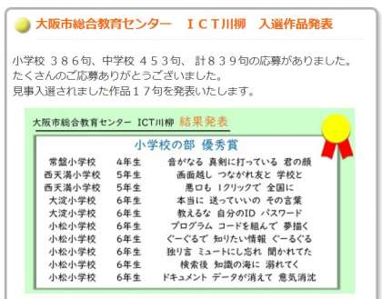 大阪市教育センター主催の「ICT川柳」に応募し、本校児童6年生2名が選ばれました。素晴らしい!子ども達にとって身近なものになってきた学習者用端末。使う良さや課題が表現されている句がたくさんありました。大阪市教育センターのホームページに掲載されていますので、ぜひご覧ください。