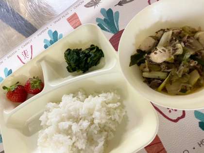 今日は旬の野菜「ほうれんそう」がおひたしとして、旬の果物「いちご」がデザートとして提供されています。