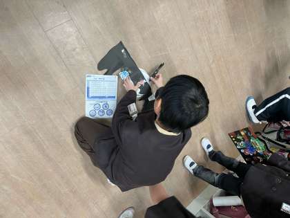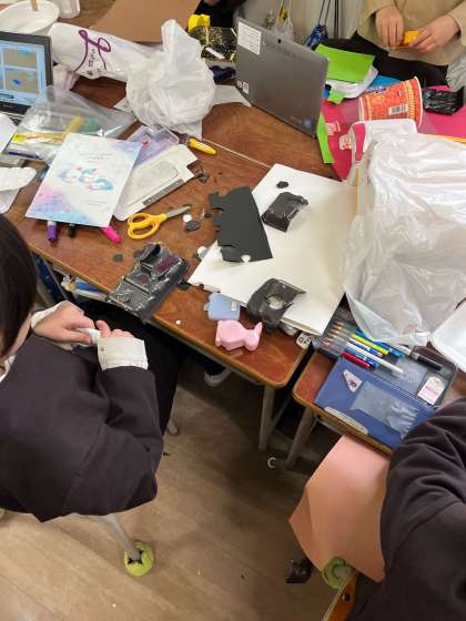 容器の切れ端や画用紙などをていねいに貼りつけて、自分だけのおもちゃを作りました。