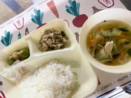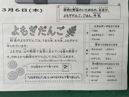 給食の「よもぎだんご」は、うるち米、もち米、よもぎから作られています。「きな粉」をかけていただきます。