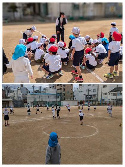 1年生が、先日保育修了したばかりの幼稚園きりん組のお友だち(預かり保育)と交流しています。