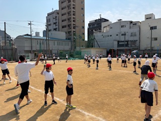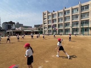 来週の体力テストに向けて、今日は投げる運動をしました。ポイントは横向きで立って、ひじを上げて体をひねって投げること。苦手な人は2mや3mとなってしまいます。ポイントを守り、目線を上げて気持ち上に投げると記録は向上します。来週の体力テストが楽しみです。