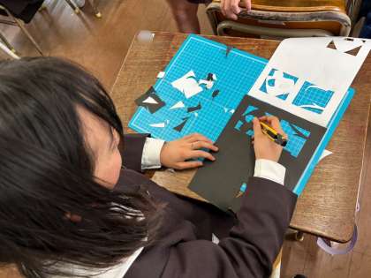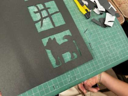 枠の中に下書きした線をカッターで切り抜くと、名前とマークが浮かび上がってきました。